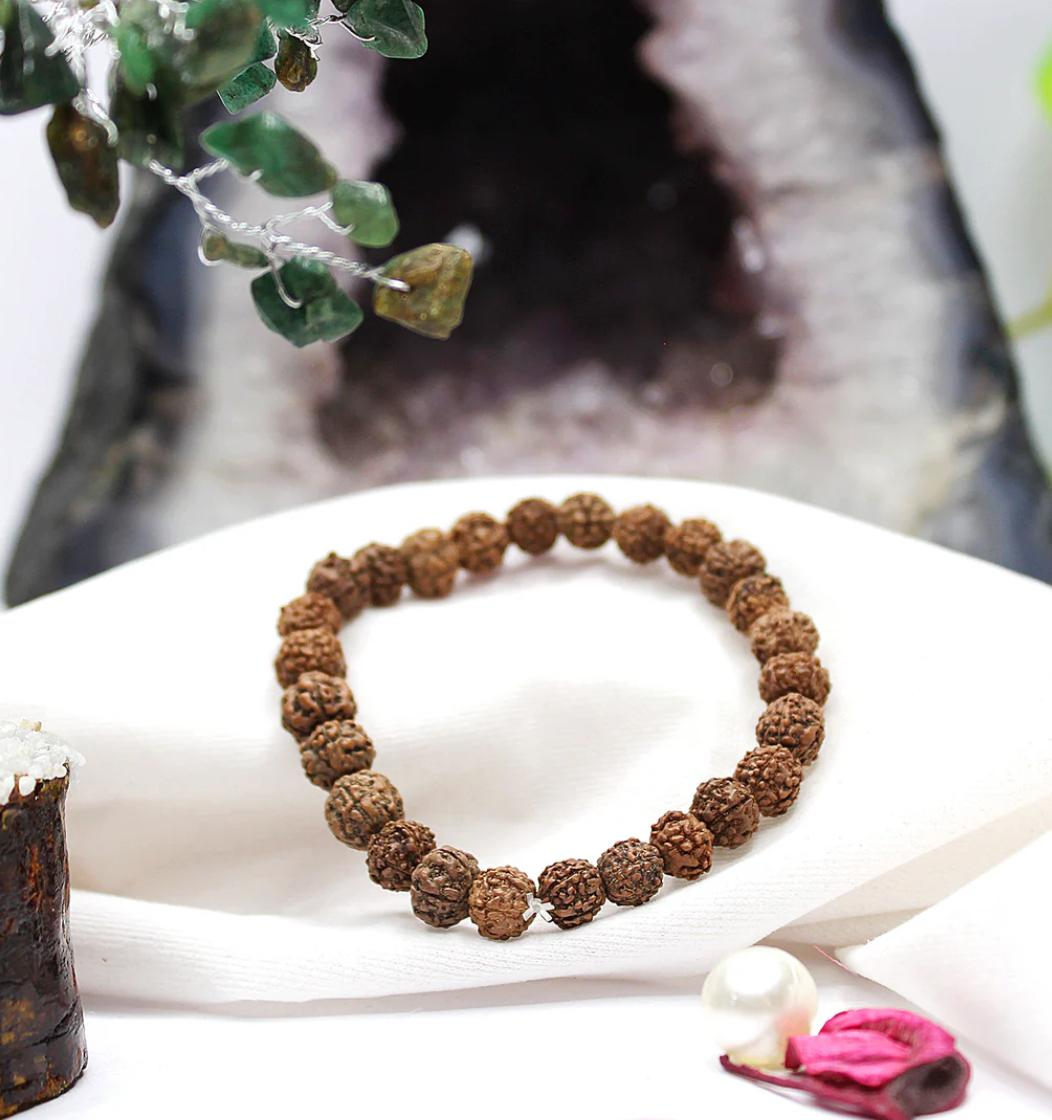 Rudraksha Bracelet pleases lord Shiva, makes spiritual, wards off negativity, protects from evil forces, calms the body & mind, balances the water element, supports travelling, connects with the divine, cleanses & purifies the aura, develops devotion, clear Karmas, removes fault, and makes one ideal.